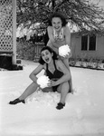 Anna Bell Eggen and Sue Massey playing in the snow while wearing bathing suits.