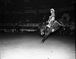 Southwestern Exposition and Fat Stock Show participants Claude Morris, Chandler, Arizona, on Bear Park, a bucking horse.