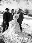Ray Baldwin, Joan Moore, and Peggy Mize standing beside snow man.