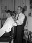 William V. Loyd getting a haircut from his favorite barber, D. A. Honeycutt, at their shop at 1602 East Vickery Boulevard, Fort Worth, Texas.