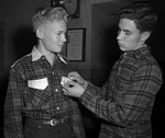 Bob Petrie pins a replica of a six-shooter gun on Rex Hendrix during McLean Junior High School's "Howdy Neighbor" week. The gun bears the name of Rex Hendrix