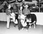 Two Hereford steers, bred by Guy Garren (left) Van Horn, Texas at the Southwestern Exposition and Fat Stock Show. The steer on the left is shown by Patsy Moody, Fort Stockton, Texas, while the other steer is shown by Frank Morris, Van Horn, Texas.