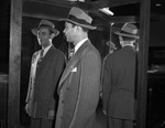 Ernest Allen modeling a pearl gray, snap brim hat on Spring Felt Hat Day.