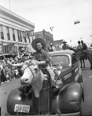 XIT reunion at Dalhart. Lathem Ranch float with Miss Mary Kathrine Lathem just back of steer head, seen wearing cowgirl clothing.