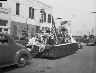 XIT reunion at Dalhart. American Junior Red Cross float seen cruising down the street with children sitting around.