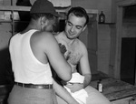 Fort Worth Cats baseball player George Pfister getting a rub down from trainer Alec Thomas.