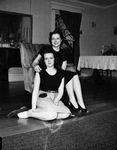 Mrs. Bernard H. English, 1501 Cooper, has been elected president of the Bible Section of the Junior Woman's Club. She is councilor of the senior high department at the First Methodist Church. In this picture is Mrs. Bernard H. English and her her daughter, Lovelyn, fourteen. Mrs. English is seated on a sofa while her daughter sits on the floor in front of her with her legs folded backwards in the living room. Mrs. English is wearing a short sleeve Knee length dress while Lovelyn is wearing a Knee length skirt and blouse with a small belt. In the background is a dinning table with a table cloth and a cabinet with a mirror and some china show pieces. Published in the Fort Worth Star-Telegram morning edition, March 18, 1947.