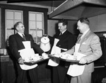 Baptist evangelists, pastors and gospel singers revival breakfast. Arranging and serving breakfasts are (from left) Reverend E. L. Carnett, host pastor; Reverend W. Fred Swank, Sagamore Hill pastor and A. A. Jackson, business manager of the host church. In the picture, the pastors and the manager are wearing suits and aprons while carrying trays with cups, saucers and a coffee pot. They are all smiling and laughing. Published in The Fort Worth Star-Telegram Morning Edition March 18, 1947.