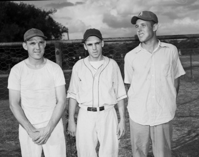 Amateur All-Stars (left to right) Clifton Jacobs, Worth Clothiers; Shortly Lewis, Smithfield; and Paul Sorrells, Worth Clothiers. All three men are seen standing outside side by side each other.