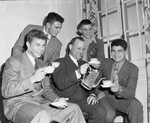 Barron McCulloch, Frog Club President, pouring coffee for all-state schoolboys considering Texas Christian University (T. C. U.) (from left) Kyle Rote, San Antonio, Texas, McCulloch, Jarrell Price, Brownfield, Texas, (back row) Milton Price, Borger, Texas and Don Cunningham, Graham, Texas.