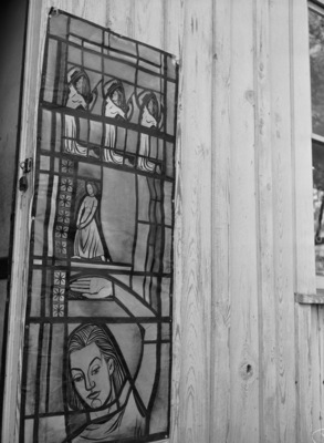 For the Texas State College for Women Little-Chapel-in-the-Woods. This is a drawing of one of the designs for a stained glass window in the chapel. The designs are being created by students. Nine of the windows carry out the theme of Woman Ministering to the Needs of the World.