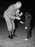 Stock Show. Mr. Amon Carter Sr. handing doll to little girl. In the picture Mr. Carter is bent over giving a doll dressed in a cowboy attire to a little girl outdoors. Mr. Carter is wearing a suit and tie with cowboy boots while the little girl is wearing a long sleeve buttoned shirt, pants, and shoes. They are both facing each other and she has her right hand stretched out to collect the doll.
