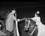 Stock Show. Mr. Carter handing award to horseback rider. Mr. Carter is stretching his hand across a railing giving an award to a lady riding a horse. The lady is wearing a dress with layers and has a ribbon in her hair. Mr. Carter is wearing an overcoat on his outfit and cowboy boots. In the background, there are many people seated in the audience where Mr. Carter stands. The woman is holding the lead of the horse and the horse is wearing a bridle.