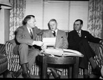 (From left) A. Z. Baker, Cleveland, Ohio, president of the American Stockyards Association; C. E. Weymouth, Amarillo, Texas, president of the Texas and Southwestern Cattle Raisers' Association, and Claude A. McCan, Victoria, Texas, ex-president of the Texas and Southwestern organization. In the picture, the men are seated on a couch and have a coffee table in front of them with a notebook on it. Mr. Weymouth and Mr. Baker are holding a paper together and the three men are looking at it. The men are wearing suits. Published in The Fort Worth Star-Telegram Evening Edition March 17, 1947.