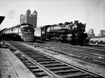 Side by side, the gaudy new T&P Diesel outshines the old type locomotive. The Diesel took the Sunshine Special to St. Louis soon after it was brought here Monday afternoon from El Paso by the old type locomotive. Shown are the new Texas and Pacific diesel engine (left) and the old type locomotive on the right. Published in The Fort Worth Star-Telegram Morning Edition March 18, 1947.