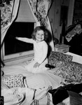 Tonya Maples, three year old, is pointing to window through which she saw a burglar breaking into grocery across the street. The curtains on the window, and the pillow cases have flower patterns on them while the bed sheet is plain. In the background is a side table and a shelf. Tonya Maples is daughter of Frank Maples. Published in the Fort Worth Star-Telegram.