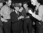 Fort Worth Star-Telegram City Circulation Department barbecue attendees (from left) George Jobe, Dub McPhail, Haywood Tucker and Clyde Devoll rolling cigarettes. This photograph was published in the "Star-Telegram Junior" a newspaper published for Star-Telegram employees.