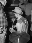 Fort Worth Star-Telegram City Circulation Department barbecue attendee Frank Burkett at a microphone while singing and playing the piano. This photograph was published in the "Star-Telegram Junior" a newspaper published for Star-Telegram employees.