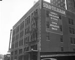 Side and rear view of Star-Telegram building, on 6th and Taylor Streets, Fort Worth, Texas, with sign reading "Largest Circulation in Texas Over 200,000 Daily."