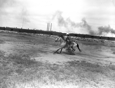 Image shows Fern Sawyer, Crossroads, New Mexico, riding her horse in an open field. A train is shown in the background. She has won numerous prizes in cowgirls sponsor contests and is very much a part of the Southwest rodeos. She is the daughter of Mr. and Mrs. U. D. Sawyer. She is wearing a blouse, trousers, cowgirl hat and cowgirl boots. Published in the Fort Worth Star-Telegram morning edition September 1, 1940.