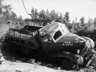 National Guard maneuvers in Louisiana. Wreckage of the truck which went off a 12-foot embankment, killing three guardsmen. The truck, occupied by several guardsmen, went off the embankment when the driver was blinded by lights of another vehicle.