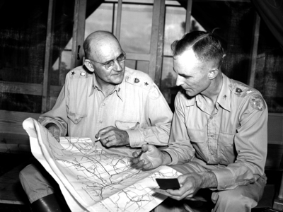 Texas National Guard maneuvers in Louisiana. Discussing communication problems at the National Guard Encampment at Cravens, Louisiana are Brigadier General Robert O. Whiteaker (left) of Buda, Texas, commanding officer of the Second Brigade, Field Artillery, and Lieutenant Colonel R. L. Cox of Denison, Texas, signal officer of the Thirty-sixth Division. Both men are seen looking at a map.