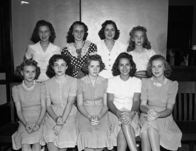 New officers of Chi Delta Chi Sorority, recently installed are in the back row, from left to right, Misses Doris Rogers, treasurer; Venita Henkelman, business manager; Ruth Steinhauser, pledge mistress; and Dixie Peters, parliamentarian. Front, in the same order, Misses Ruthe Subbie, reporter; Vickie Moran, corresponding secretary; Royane Olmsted, recording secretary; Dorothy Bryant, president; and Carol Elmore, vice president. Mrs. Mertz K. Williamson is the new sorority mother.
