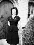 Miss Ina Copas of Nashville, Tennessee who is the guest of Mr. and Mrs. H. B. Davis and of Mr. and Mrs C. D. Davis. She is to marry Mr. William Owen in June. In the picture, Miss Copas is wearing a black dress with a belt. She has her hands crossed behind her back and is standing in front of a semi circular door with an iron decoration and beside a cypress. She is smiling at the camera. Published in the Fort Worth Star-Telegram evening edition, March 25, 1947.