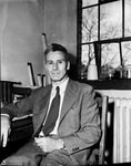 Shown here is W. L. Hughes, teacher and acting head of the biology department at North Texas Agricultural College (NTAC). In the picture, Hughes is sitting on a chair with his right hand resting on the desk. He is wearing a suit and tie. In the background is a divided lite window with a view of a tree with fallen leaves and on the window sill are small jars with liquids in them. Published in the Fort Worth Star-Telegram evening edition, March 25, 1947.