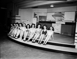 Fort Worth photographers' entries in the Press Photographer Queen contest are (from left to right) Nancy Thompson, Jeanie Schow, Pat Kane, Helen Alexander, Maggie Gilliepie, Dolores Pope, Edlyn Shelton, Jean Muntz, Jean Meek and Dorothy Brown. In the picture the ladies are dressed in their bathing suits and heels. They are seated on a stage with two steps and smiling at the camera. In the background is a kitchen setup with the oven, refrigerator dishwasher, counter tops and kitchen cabinets. These ten girls will compete with a group sponsored by Dallas cameramen in Arlington, Texas to select a representative of Fort Worth -Dallas Press Photographers Association to the national Press Photographer Queen contest in Atlantic City in June. Published in the Fort Worth Star-Telegram evening edition, March 26, 1947.