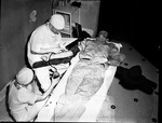 W. N. Baber donating blood at Saint (St.) Joseph's Hospital for a transfusion for Mrs. E. S. Townsend 30 minutes after she was shot in the chest at her home. Nurse Dorothy Schneider and Doctor (Dr.) W. E. Spencer are taking the blood. Mr. Baber who accidentally shot Mrs. Townsend with what he thought was a toy pistol. In the picture, Mr. Baber is laying on the bed while the doctor sits on a stool and inserting the needle and the nurse sits on the floor holding the blood bag. The doctor and nurse are in uniforms. Published in the Fort Worth Star-Telegram evening edition, March 25, 1947.