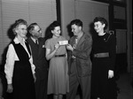 Elmer Morriss, a severely wounded soldier from Oklahoma, being presented a $12,083.33 check contributed by admirers. From left to right are Mrs. Carrie Collier, W. W. Woodworth, Mrs. Joy Morriss, Elmer Morriss and Mrs. Kathleen Everett. In the picture Mr. and Mrs. Morris are holding the check facing forward and smiling at each other while the others either faced them or looked at the camera. The ladies are wearing knee length dresses. Mr. Morris is wearing a shirt and pants with a jacket while Mr. Woodworth is wearing suit and tie. In the background are windows with blinds. Published in the Fort Worth Star-Telegram morning edition, March 26, 1947.