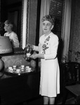 Mrs. Richard J. Turrentine of Denton, first woman to serve on the Texas Board of Public Welfare is pictured here. She is the wife of retired professor Turrentine, Texas State College for Women (TSCW). In the picture, Mrs. Turrentine is pouring tea into a cup from a tea pot while she stands in front of a mirror. She is wearing a dress with a flower pattern on the upper left part of it and a pair of eyeglasses. Governor Jester appointed her as one of the state's three-member Board of Public Welfare for a six-year term. Published in the Fort Worth Star-Telegram morning edition, March 26, 1947.