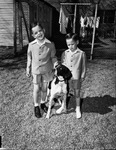 Charles Greenlee (left) and James Greenlee, sons of Doctor (Dr.) and Mrs. H. H. Greenlee, are pictured here with their pointer dog Spade. The pointer is to be exhibited in the Fort Worth Kennel Club's dog show. In the picture, the two brothers are standing with their dog between them. Charles is smiling while James has a disgruntled look on his face. In the background there is a fence made of barb wires and clothes on a line beside a house. The brothers are hoping Spade will dig right in and win a blue ribbon. Published in the Fort Worth Star-Telegram evening edition, March 27, 1947.