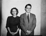 Texas Wesleyan College (TWC) Thespian stars Dorothy Sue Rowe of Big Spring, Texas, and Billy Smith of Fort Worth, Texas feature in "Guest in the house" a play by Hagar Wilde and Dale Eunson. In the picture, Dorothy is wearing a dress with three quarter sleeves and Billy is wearing a suit and tie. They are both smiling at the camera and have their hands crossed in front of them. There is a plain wallpaper in the background. The play will be presented in the Fine Arts Auditorium, April 17-18. Published in the Fort Worth Star-Telegram morning edition, March 27, 1947.