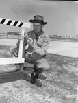 Poss Clark, Texas Christian University (T. C. U.) track coach, inspecting one of the new hurdles on the Frog's new quarter mile track.