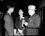 On hand for the technical discussions Thursday opening the spring meeting of the Southwest district of production, American Petroleum Institute, at Blackstone Hotel was this trio from West Texas and the Panhandle. Left to right are T. G. Post, North Basin Pools Engineering Committee, Midland; E.A. Paschal, Oil Development Company, Amarillo, and V.E. Cottingham, Midland, chairman of the North Basin group. In the picture, the three men are having a conversation. They are wearing suits and ties. Published in The Fort Worth Star-Telegram Morning Edition March 28, 1947.