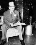 American Petroleum Institute meeting attendee, John W. House, Humble Oil and Refining Company, Midland, Texas. He was one of the early registrants. In the picture, Mr. House is seated on a chair reading a paper placed on his lap. He has a cigar in his mouth. He is wearing suit and tie. Published in The Fort Worth Star-Telegram Morning Edition March 28, 1947.