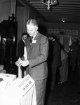 American Petroleum Institute meeting attendee, Frank A. Denker, Beckham Incorporated, Odessa. He was one of the early registrants at the Blackstone Hotel. In the picture, Mr. Denker is wearing a suit and tie while standing in front of a table counting money. In the background are other attendees of the event. Published in The Fort Worth Star-Telegram Morning Edition March 28, 1947.