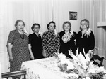 Saint Ann's Club charter members are (from left) Mrs. Richard Landis, Mrs. W. S. Baker, Mrs. J. D. Nelson, Mrs. C. J. Henrich and Mrs. H. R. Zimmerman. In the picture, the women are standing next to each other in front of a table with flowers center piece. They are in dresses and each wearing a large corsage.