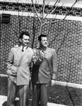 Test pilots (from left) B. A. Erickson and Gus Green who safely landed a crippled XB-36 bomber airplane. In the picture, the two men are standing underneath a tree in front of a brick wall. They are looking towards the runway at Consolidated Vultee plant where they landed the bomber airplane. Both claimed it was just a routine job. The men are wearing suits and tie. Published in the Fort Worth Star-Telegram morning edition, March 28, 1947.