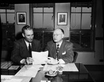 Richard E. Eggleton (right), Assistant Chief Inspector, United States Post Office in Washington, D. C., with W. M. McMillan, inspector in charge of the Fort Worth Division. Eggleton had high praise for the work of McMillan. In the picture the two men are seated at a glass table viewing a document with both men each holding the paper at one end as they glance through. Both men are dressed in a suit and tie. In the background, there are two framed pictures on the walls between the large windows where the blinds have been raised. Published in the Fort Worth Star-Telegram morning edition, March 28, 1947.