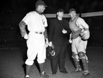 Participating in a Fort Worth Cats vs. Dallas Rebels baseball exhibition game are (from left) Cats manager Lester Burge, umpire Fred Sigler and Cats catcher George Pfister.