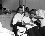 Phil North and son, Kennon, with barber giving Kennon a haircut.