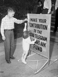 Shown here are Susan Norris and Truman Davis Whitehead. 2-year-old Susan stretches to drop a nickel into a collection bottle at Forest Park Zoo for the Sons and Daughters of the Ark fund. She is the daughter of Mr. and Mrs. Wirt M. Norris. 12-year-old Truman is waiting for his turn to make a contribution. He is the son of Mr. and Mrs. H. D. Whitehead. The collection notice saying "Make Your Contribution To The Star-Telegram Noah's Ark Fund". Published in the Fort Worth Star-Telegram morning edition, March 31, 1947.