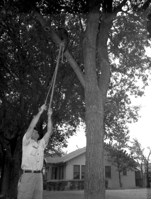 Image shows "Jocko," a capuchin monkey staged an escape on the North Side Friday morning. After a two hour chase, assistant zookeeper Julian Frazier managed to find and capture Jocko. Mr. Frazier is standing in front of a house wearing a peaked cap, a short-sleeve button-up shirt and trousers. Mr. Frazier is trying to capture Jocko, who is in a tree so that he can carry him back to the zoo. Published in the Fort Worth Star-Telegram evening edition August 9, 1940.