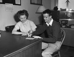 Tarrant County draft registrant. Bill Lee Perry Junior and Miss Lillian Herberger, clerk, left. The two are shown sitting at a desk in an office space as Miss Herberger looks on at Perry Junior signing his draft registration card. Miss Herberger is wearing a beaded blouse while Perry Junior wears a sweater and a pair of trousers. Behind the duo is another desk with a variety of office supplies set on top of it. A lamp and a filing cabinet can also be seen near the desk, as well as a window.