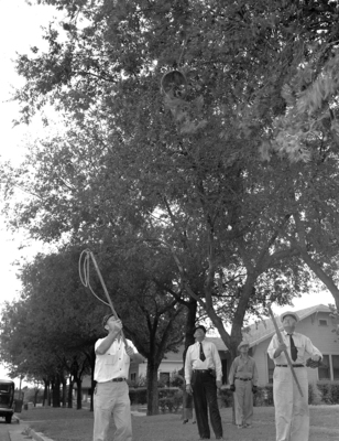 Image shows "Jocko," a capuchin monkey staged an escape on the North Side Friday morning. After a two hour chase, assistant zookeeper Julian Frazier managed to find and capture Jocko. Mr. Frazier is standing in front of a house wearing a peaked cap, a short-sleeve button-up shirt and trousers. Mr. Frazier is trying to capture Jocko, who is in a tree so that he can carry him back to the zoo. Published in the Fort Worth Star-Telegram evening edition August 9, 1940.