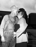 Mrs. H. C. Merritt, kissing her husband, an engineer for the Texas & Pacific railroad, as he alights from a cab after his last run with the railroad.
