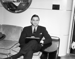 George Marshall, special entertainment director for the Pan-American Exposition in Dallas. Mr. Marshall can be seen seated in a couch, he is wearing a striped suit, with his left leg crossed, and a portfolio over his thighs. There is a mirror in the wall.